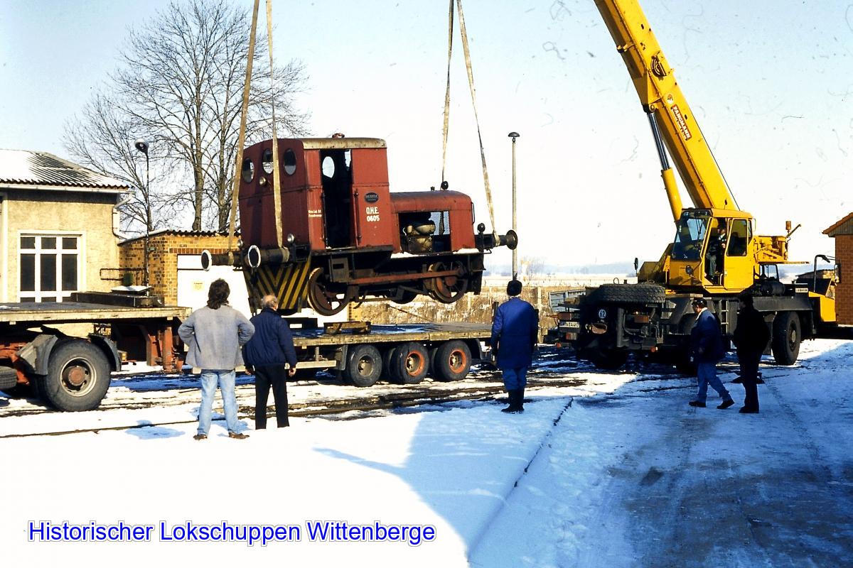 ![]() 30 years of Dampflokfreunde Salzwedel - Memories On 24 February 1996, another locomotive was added to our collection of historic locomotives. Locomotive 0605, which previously belonged to the Osthannoversche Eisenbahn and had been used for light shunting duties at Amelinghausen station, was delivered by low-loader. |