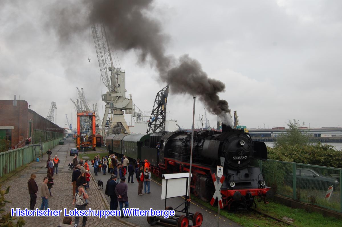 ![]() 30 years of Dampflokfreunde Salzwedel e.V. - Memories On 28 September 2007 we hauled round trips through the port of Hamburg with our steam locomotive 50 3682, starting and ending at Hamburg-Harburg station. A stop was always made at the harbour museum, where the train is shown in the following picture. |