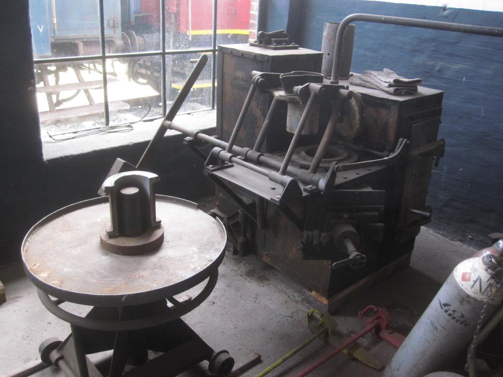 Next to that, the active members have installed a furnace. Also originally from Salzwedel, this furnace was for melting white metal for casting the bearing shells for axles and driving rods of locomotive. The furnace was fired with heating oil. The pictures show on one side the bearing metal in bar form, on the other side, the furnace.