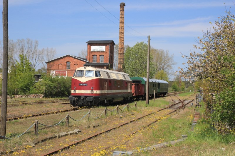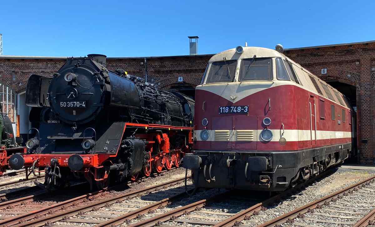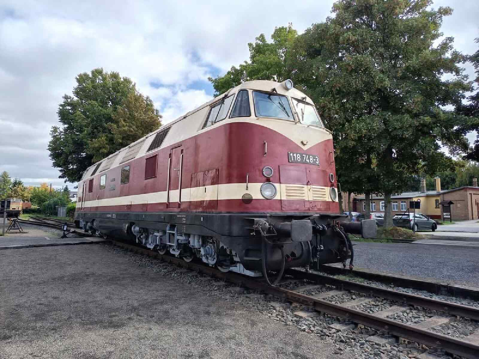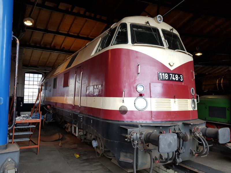 On Saturday, our diesel locomotive 118 748 undertook some test running. In order to be able to use it again soon, all hydraulic, electrical, pneumatic and mechanical systems had to be thoroughly tested. The locomotive is seen here on the turntable in beautiful sunshine.