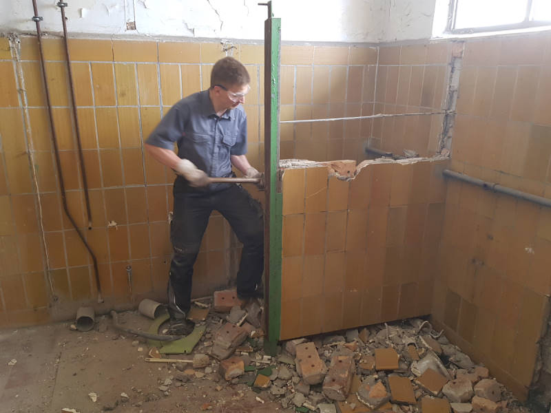Last Saturday, work was done on several projects at the same time. Let's start with the work in the former toilet facility, which is attached to the outside of the rear of the locomotive shed: Since a reopening to the public was out of the question due to missing inlets and drains and poor access, we decided to gut the premises and convert them as storage for small parts. This makes sense in the medium term, because there are boxes and boxes of screws, nuts, cotter pins and gaskets everywhere, which will now hopefully soon find an orderly place.