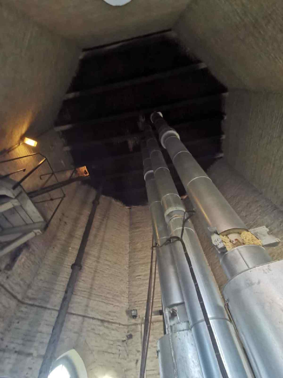 If you open the entrance door, you get into the shaft of the tower. Here you can see thick pipes in the middle that reach vertically from the floor to the ceiling. There are three pipes in total. Groundwater from our well system is pumped up into the storage tank through one of them. Through the other two pipes, water rushes down from the storage tank when one of the three water cranes located in the compound is opened.
