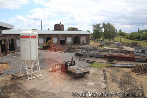Die Arbeiten im und am Lokschuppen in Wittenberge schreiten weiter voran. Inzwischen wurde die Verputzung des Lokschuppens weiter vorangetrieben und die Gleisbereiche vom Schutt befreit. Nun können auch die elektrischen Ausrüstungen, die Lampen, sowie die Wasser- und Druckluftversorgung eingebaut werden.