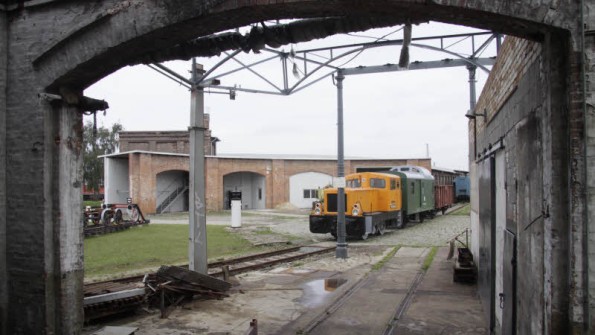 Noch sind die Reste des Lokschuppens 1 eher Ruine als Unterstand. Der runde, gepflasterte Bereich unter der orangen Lok war einst die Drehscheibe.