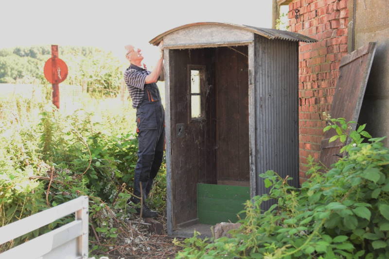Noch sind die Reste des Lokschuppens 1 eher Ruine als Unterstand. Der runde, gepflasterte Bereich unter der orangenen Lok war einst die Drehscheibe. |