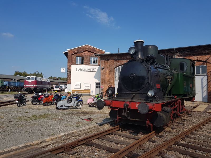 Während dessen wartete Dampflok Emma noch auf ihren großen Einsatz am Sonntag und begegnete dabei einer ganzen Flotte von „Schwalben“, die einen Ausflug von Dessau bei Arendsee zu uns absolviert hatten