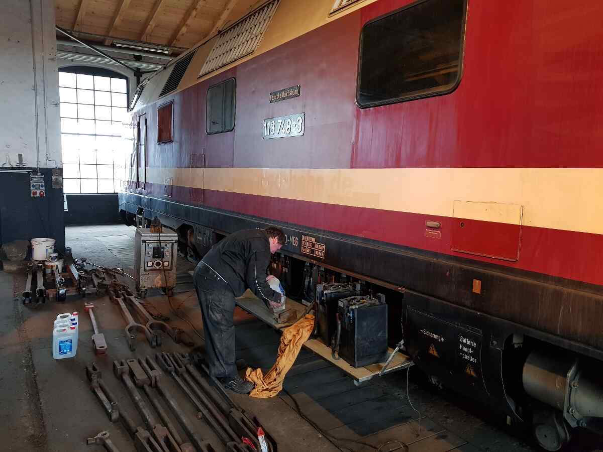 June 3, 2023 was a great day for us, because there were sounds in the air that had not been heard for a long time. This had the following background: The refurbishment of further diesel locomotives was started. First of all, this includes our diesel locomotive 118 748. This machine was built in 1968 at Lokomotivbau Karl Marx in Babelsberg and was in service until May 2015, most recently in front of freight trains. It has two engines with 1,000 hp each and can travel at speeds of up to 120 km/h.
