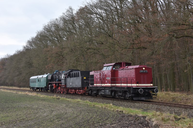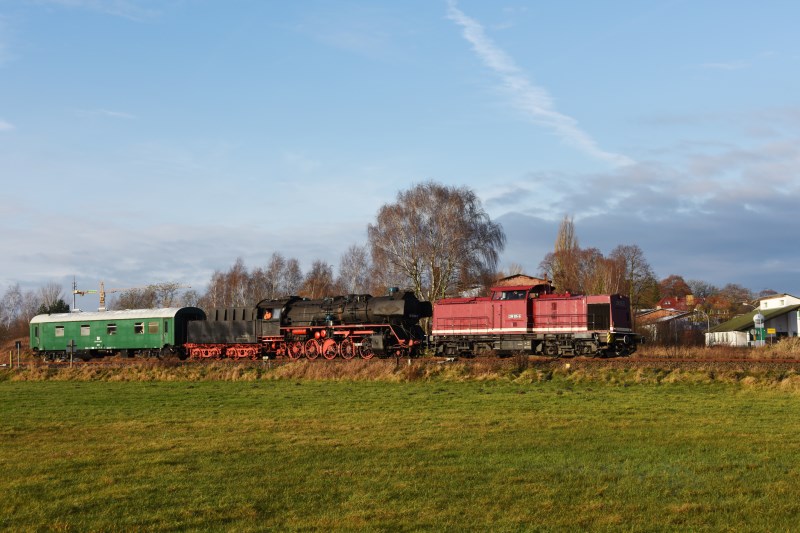 On 10.12.2017 we therefore sent her, towed by a diesel locomotive on her way to Neustrelitz, where there is an underfloor wheel-turning lathe. Here the whole locomotive is driven onto the lathe and the wheels are turned in an installed condition by the lathe's powerful electric motors. Then a turning tool is driven against the wheels and metal layers are removed from the running surfaces of the wheels until the profile is right again. The pictures show the transfer of the steam locomotive to Glash
