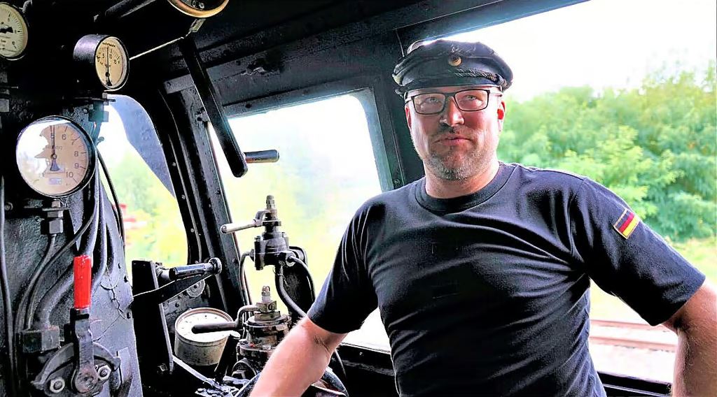 Dennis Kathke ist 2. Vorsitzender der Eisenbahnfreunde und nimmt Besucher im Führerstand einer Dampflok mit.